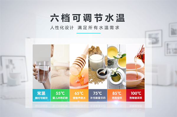 飲水機以加熱飲水為根本,不同的生活場景對于水溫的需求也各不相同。傳統飲水機多為常溫水和熱水雙重選擇,使用限制較大。為提升產品的人性化體驗,榮事達智能溫熱飲水機采用六檔可調節水溫設定,常溫、55℃、65℃、75℃、85℃、100℃,不同水溫可以充分滿足大眾直飲、沖奶、泡茶等各類飲水使用需求,生活更為簡便。