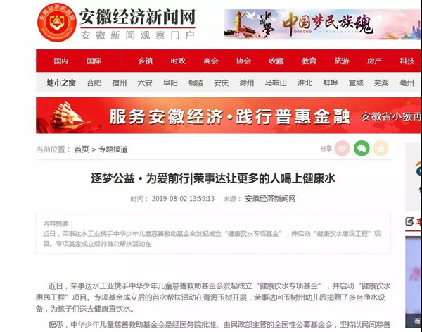 安徽經(jīng)濟(jì)新聞網(wǎng) 《逐夢(mèng)公益 · 為愛(ài)前行|榮事達(dá)讓更多的人喝上健康水》