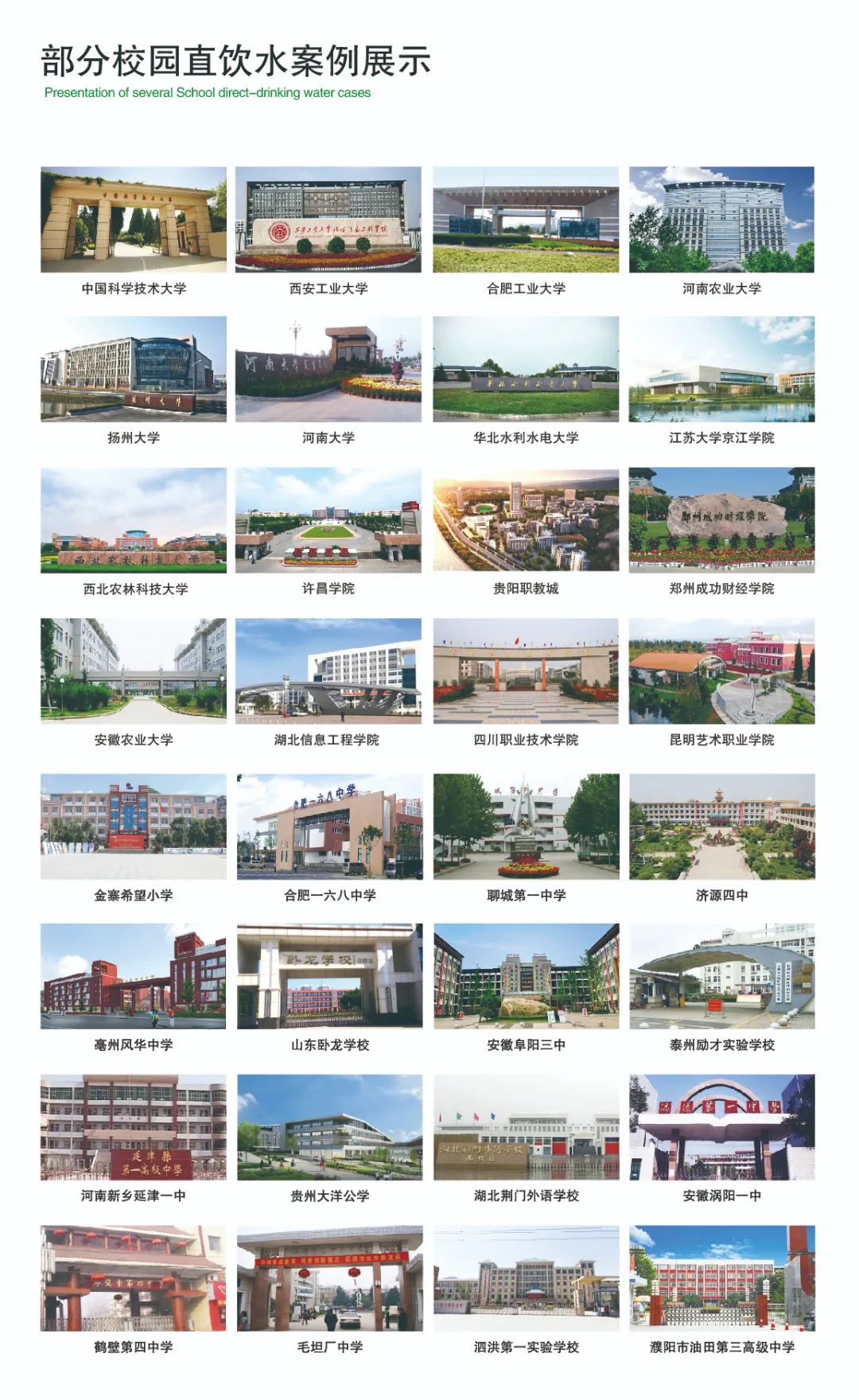 榮事達(dá)水工業(yè)先后承建了中國科學(xué)技術(shù)大學(xué)、河南大學(xué)、西北農(nóng)林科技大學(xué)、江蘇省丹陽市第五中學(xué)等3000多所學(xué)校的直飲水工程,‘喝’護(hù)千萬師生飲水健康。