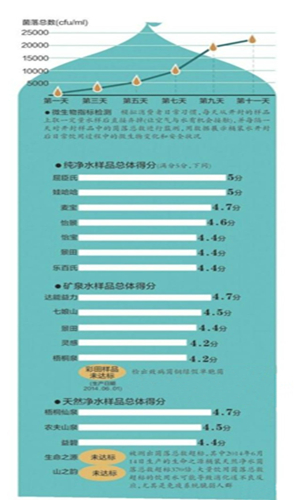 本次比較試驗還模擬日常飲用水習慣,在設計的檢測周期內,每天取一定水樣,定時監測菌落總數。實驗中,大多數水樣隨著開瓶時間越來越長,菌落總數呈增長趨勢,開瓶第5-7天后,出現急劇增長態勢。